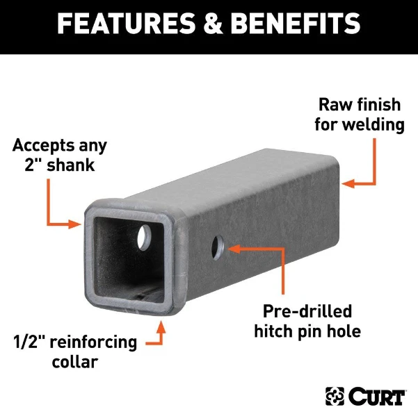 CURT fabrication steel receiver tubing can be used to extend the reach of your receiver or to create a piece of custom towing equipment. Each unit is equipped with a 1/2″ reinforcing collar for extra strength and has a raw finish to be ready for welding. This receiver tube has a 2″ x 2″ opening and measures 9″ in length.