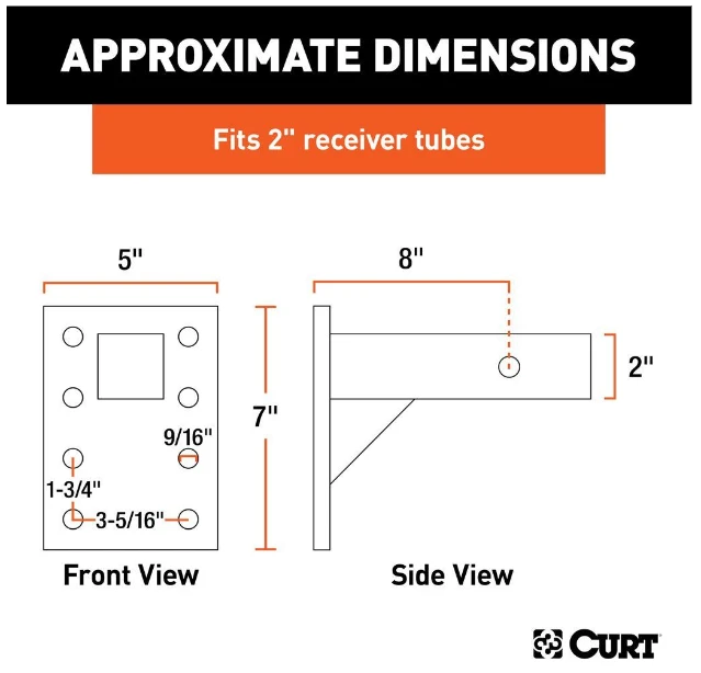 This adjustable pintle mount is designed to accept a bolt-on pintle hook or combination ball and pintle. It features a series of mounting holes to provide three different mounting heights for the hook and can be mounted in any 2″ x 2″ receiver tube opening. This pintle mount offers a gross trailer weight capacity up to 10,000 lbs. and features a total plate height of 7″, providing up to 6-1/2″ of drop (NOTE: Not for use in rise position; never exceed the lowest weight capacity of any towing component; i.e. the vehicle, hitch, trailer, etc).