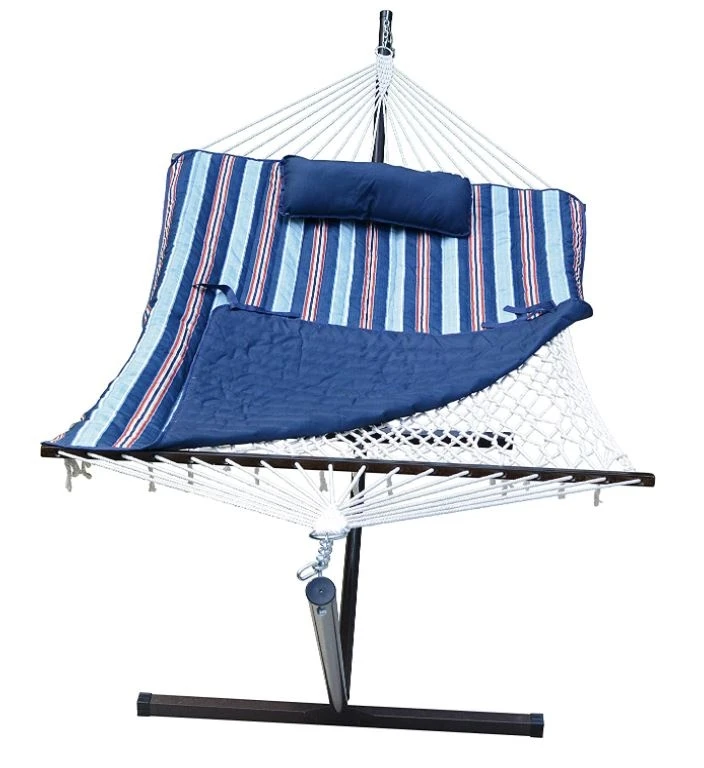 The all-in-one natural cotton rope hammock is designed at heart to soothe the rattled body of modern life. It does so with a 52″W x 76″L hand-woven hammock bed that is constructed of all natural cotton rope that gently shapes to the body’s natural curvature. The no-tool assembly hammock stand is made of rust-resistent powder coated tubular steel which includes mar resistent plastic feet. A stylish quilted hammock pad and matching head pillow further enhance the soothing experience. Designed for one person, this hammock will help enable the solitude you are seeking, if only for a few restful minutes or hours.