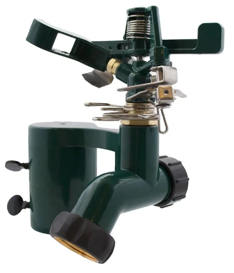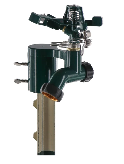 The Orbit zinc impact head provides a long life for an exceptional value. Easily adjust the spray pattern from a partial circle to full coverage with a spray distance of up to 80 feet (5,670 Sq. Ft.) in diameter when set to full circle. Clog resistant flow through base allows multiple sprinklers to be connected together. Angled hose connector allows for easy attachment to standard garden hose. Thumb screw secures base to the post, while allowing easy removal. For use for lawns, gardens, pastures, & more. Zinc head provides a long life for an exceptional value.Â