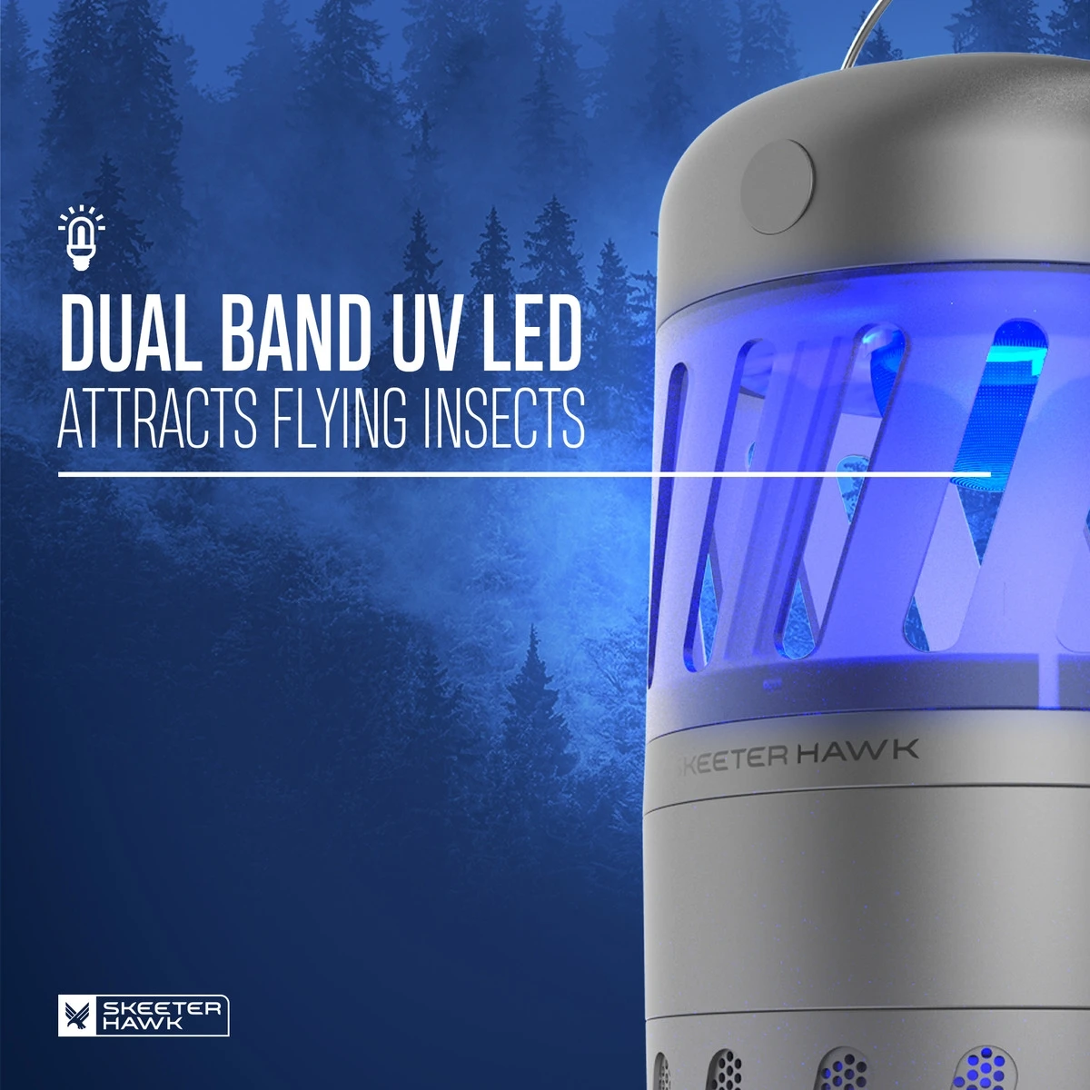 Dual Band LED UV light attracts pesky mosquitoes and other flying insects, while the whisper quiet fan sucks them in where they dehydrate and die. The Patio Mosquito Trap effectively protects patios, porches and decks. The foldaway hook and long cord, allow for versatile placement.