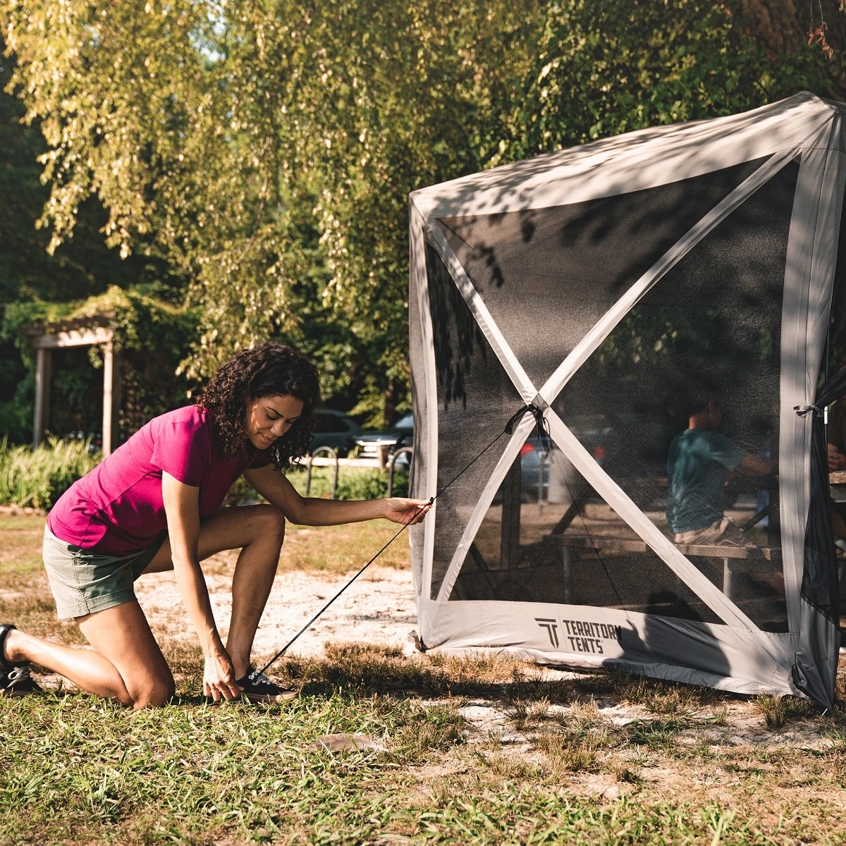 The Territory Tents® 6-Sided Screen Tent is ready to use right from the box. The Jet Set Framework allows you to set up shade in a matter of seconds, no assembly required. The mesh wall panels provide air flow but keeps the bugs out so you can enjoy Mother Nature without the pests. The 6-sided design fits a standard picnic table with room to spare. When it is time to pack up slide your screen tent back into the easy-to-use carry bag. Pack your Territory Tent® Screen Tent for your next backyard BBQ, an outdoor sporting event or use it to enjoy bug free evenings on your deck.